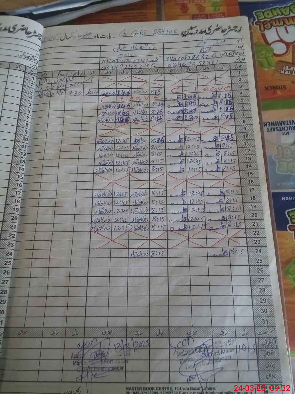 | CNIC | Full Name | Designation | R/C | Absence during last cal. month |