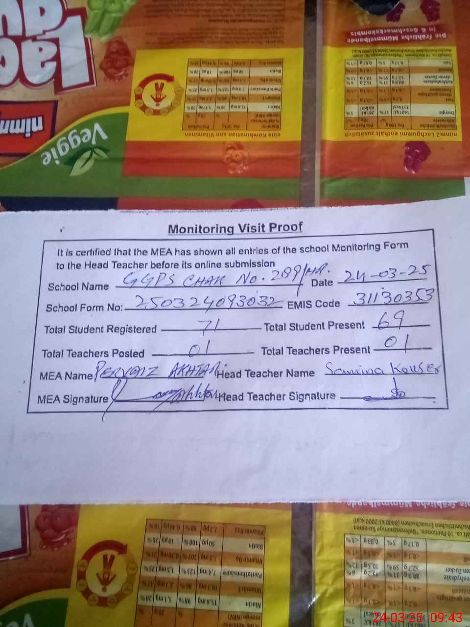 | Attendance Register | Head Teacher | MEA with School | Visit Proof |