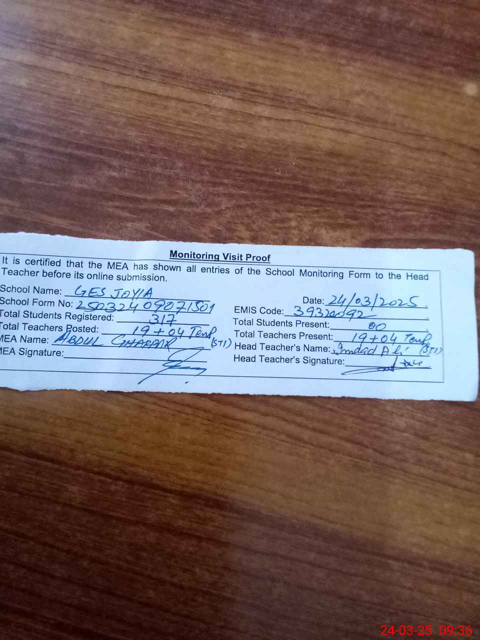 | Remarks (Use Separate Page if Required): 01 EST teacher named zulifqar attached from GES Tariqabad to GES Joyia since 26 Nov 2024 03 STI present in the school | |||||