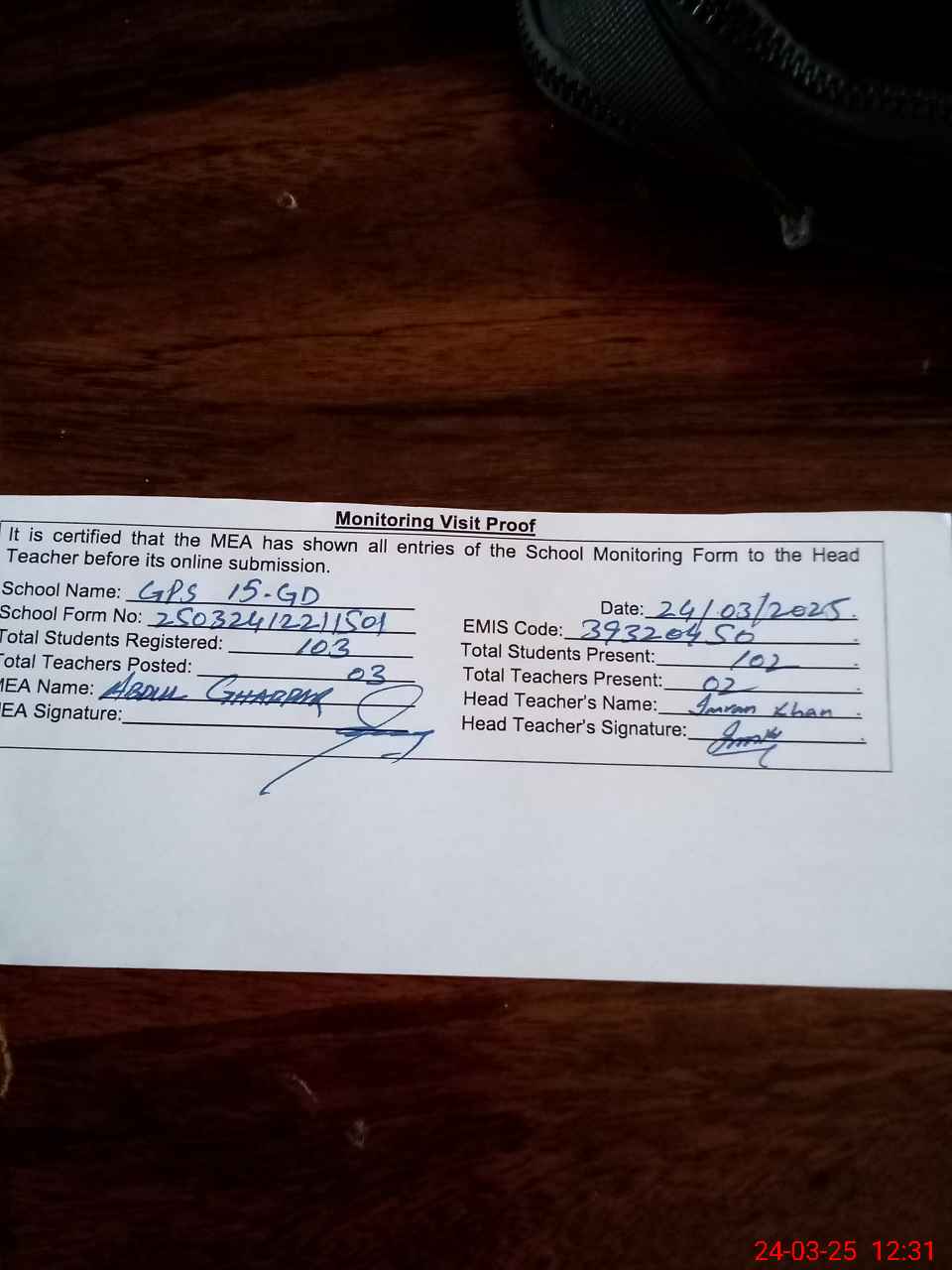 | Attendance Register | Head Teacher | MEA with School | Visit Proof |