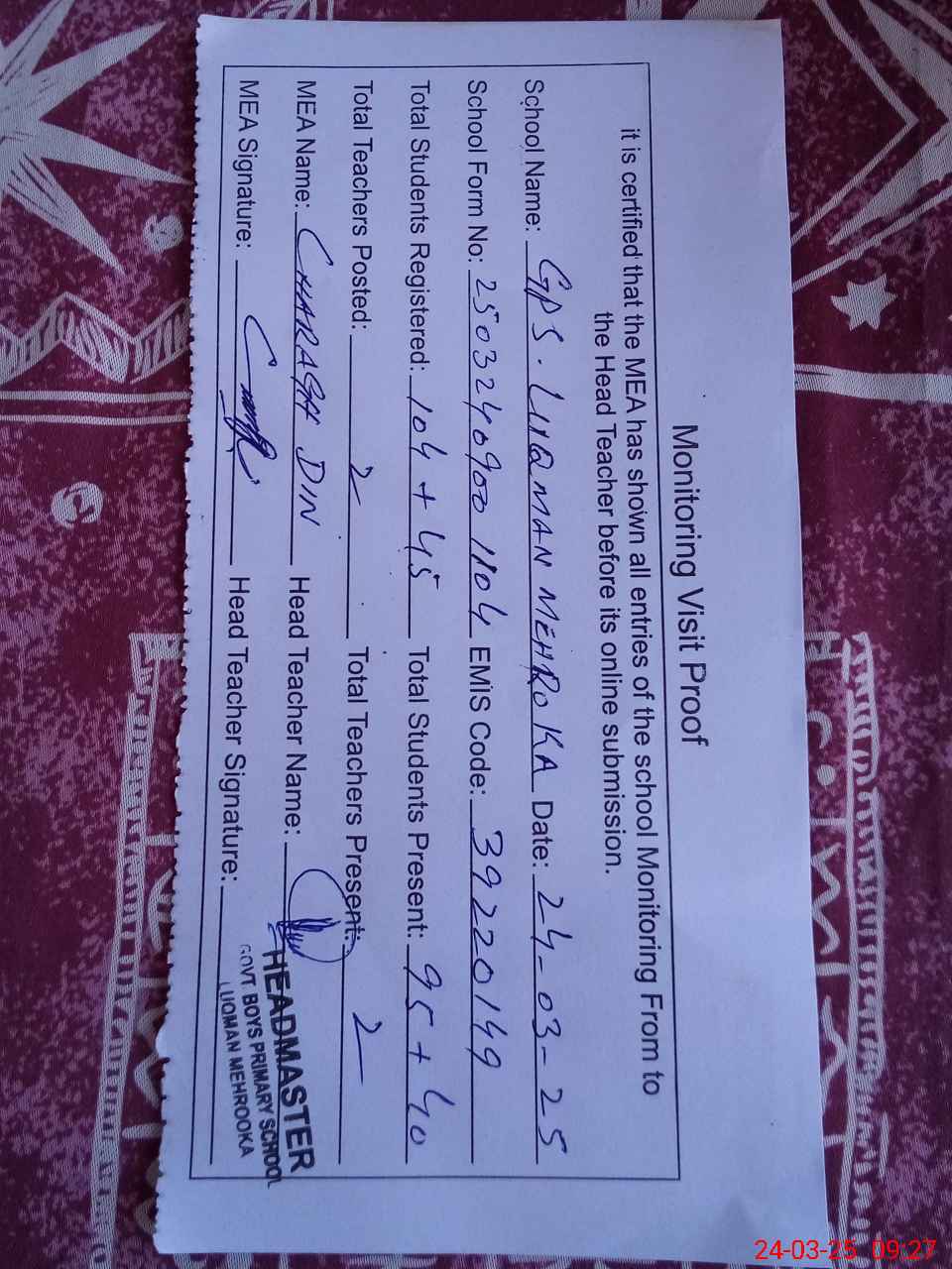 | Attendance Register | Head Teacher | MEA with School | Visit Proof |