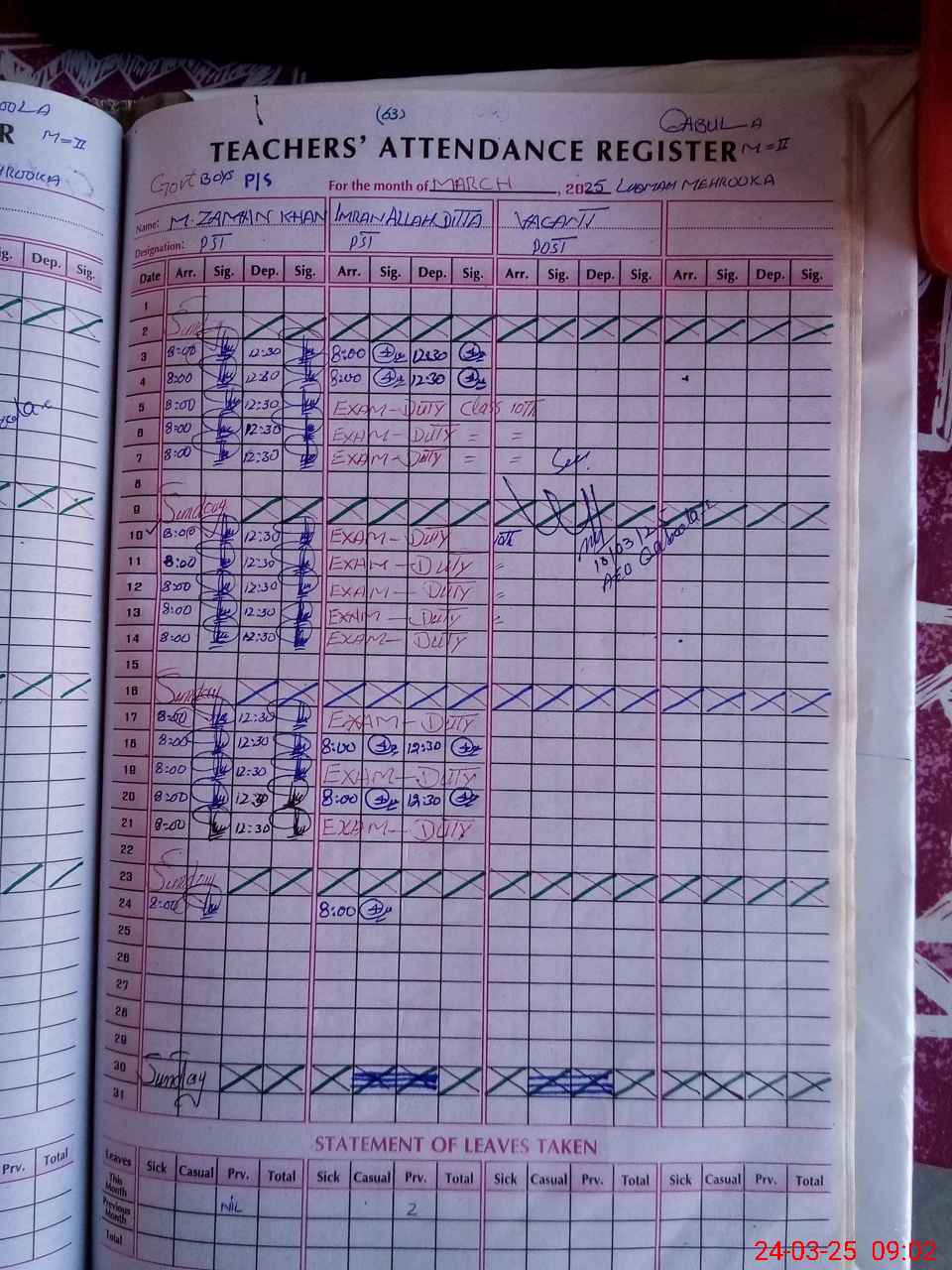 | Leave | Duty | Absent | Maternity | Medical | Ex- Pak |