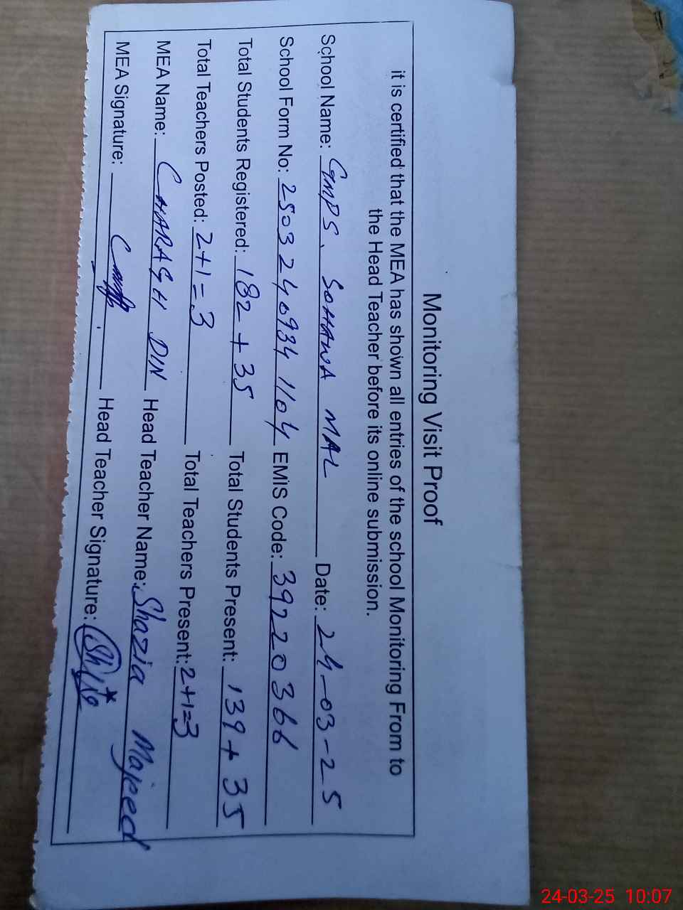 | Certified that this School was Inspected by the Undersigned MEA/DMO Today and the Information Stated Above is as Per Record. | |||||