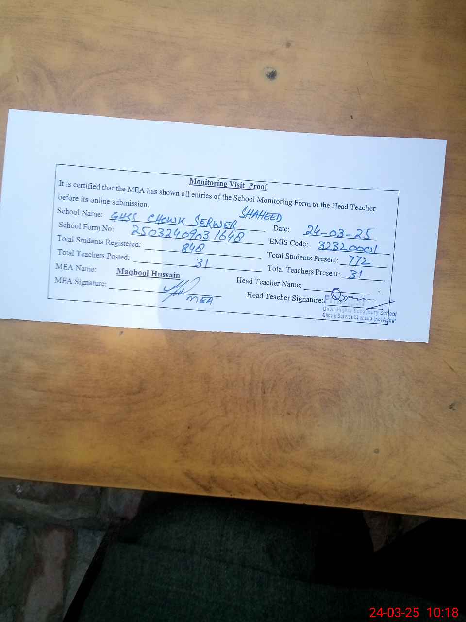 | EMIS Code: 32320001 | Name of School: GHSS CHOWK SARWAR SHAHEED | |||