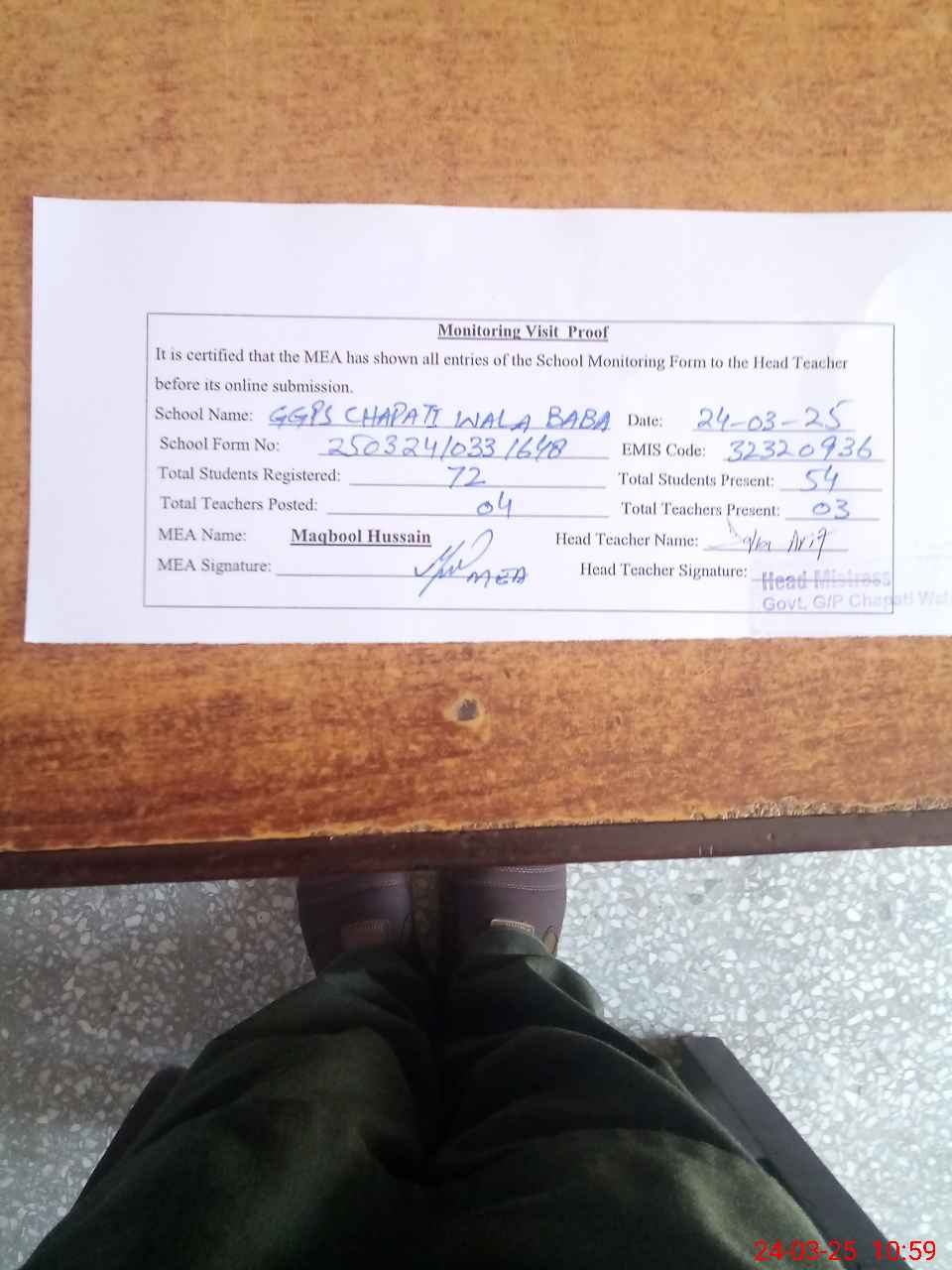 | Attendance Register | Head Teacher | MEA with School | Visit Proof |