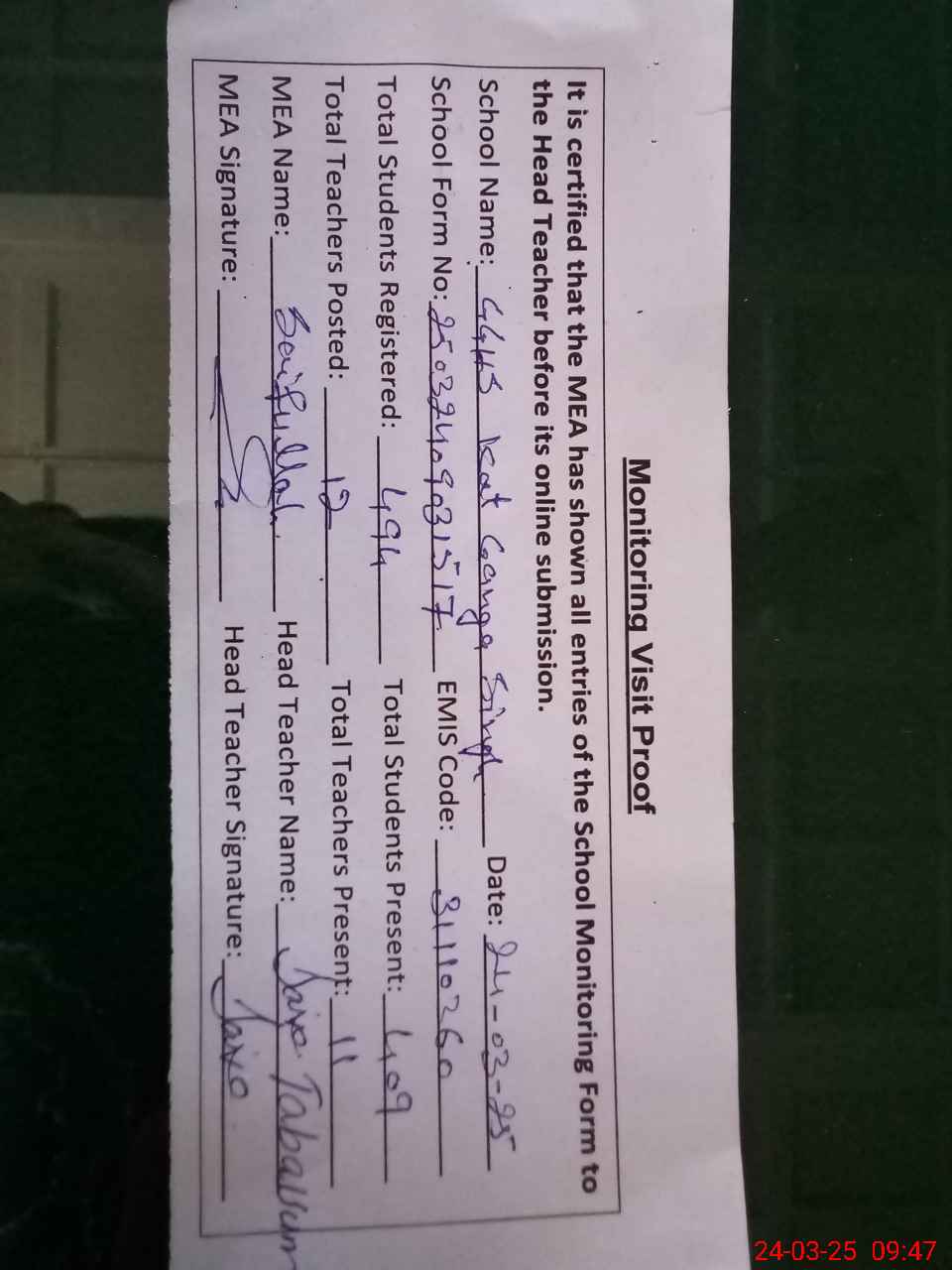 | Attendance Register | Head Teacher | MEA with School | Visit Proof |