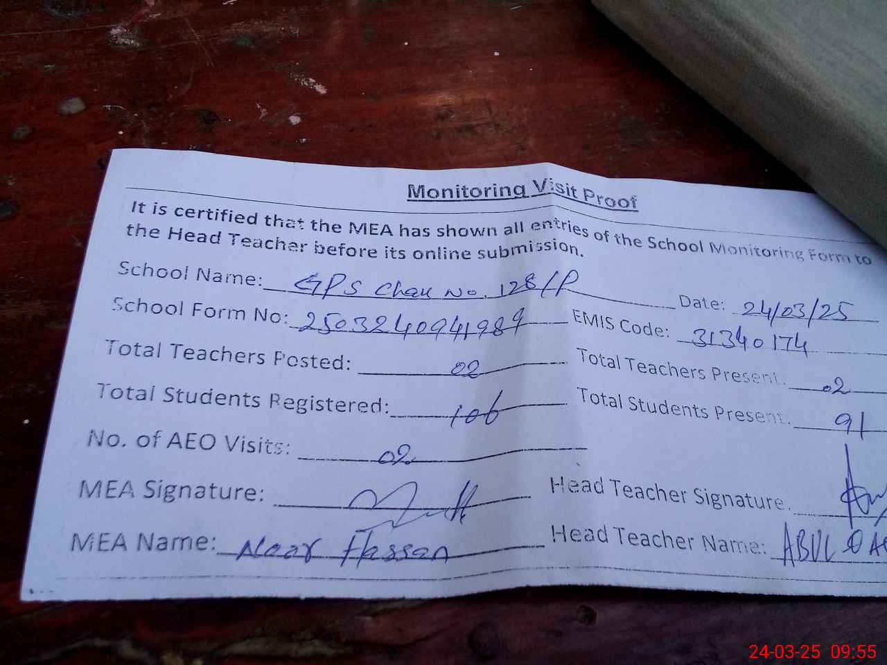| Attendance Register | Head Teacher | MEA with School | Visit Proof |