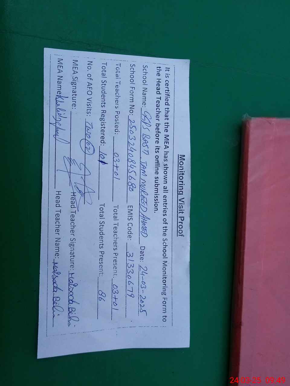 | Attendance Register | Head Teacher | MEA with School | Visit Proof |