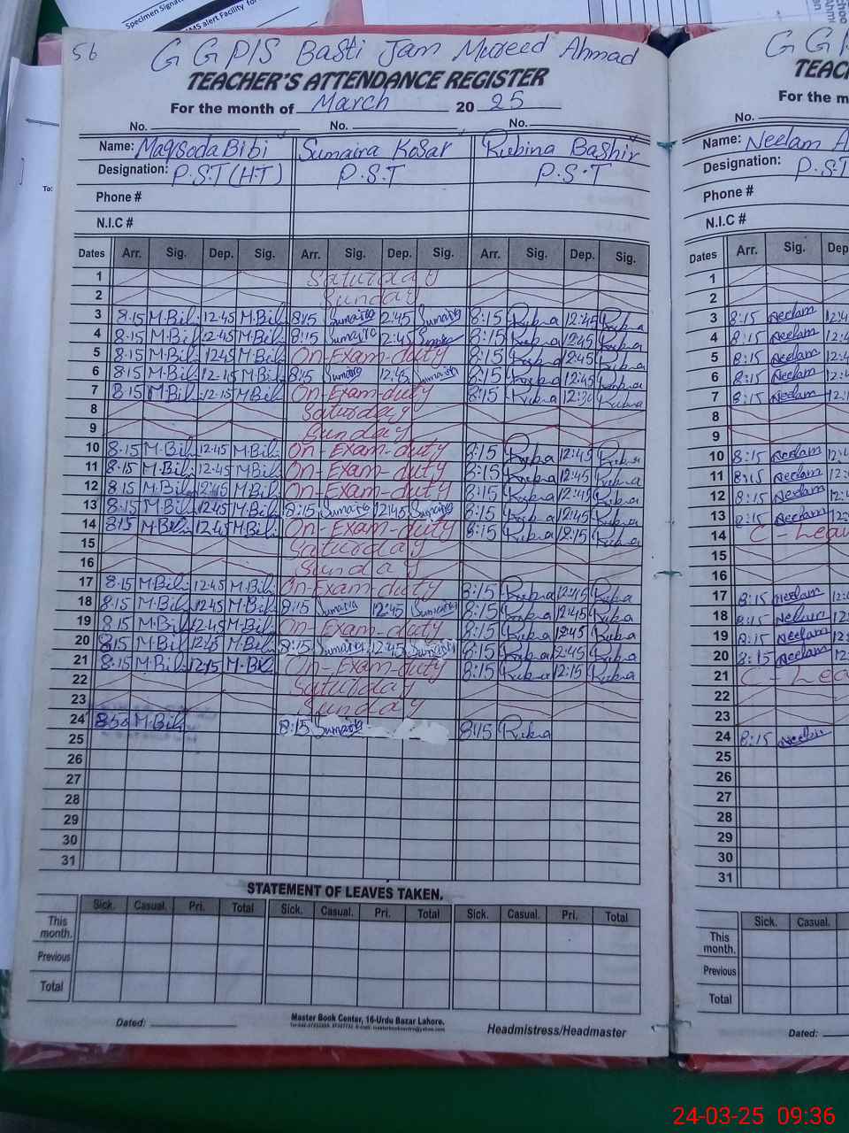 | Leave | Duty | Absent | Maternity | Medical | Ex- Pak |