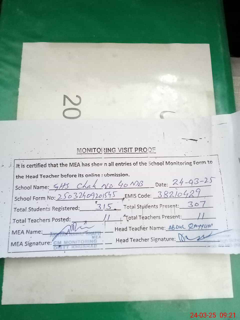 | EMIS Code: 38210429 | Name of School: GHS CHAK NO. 40 MB | |||