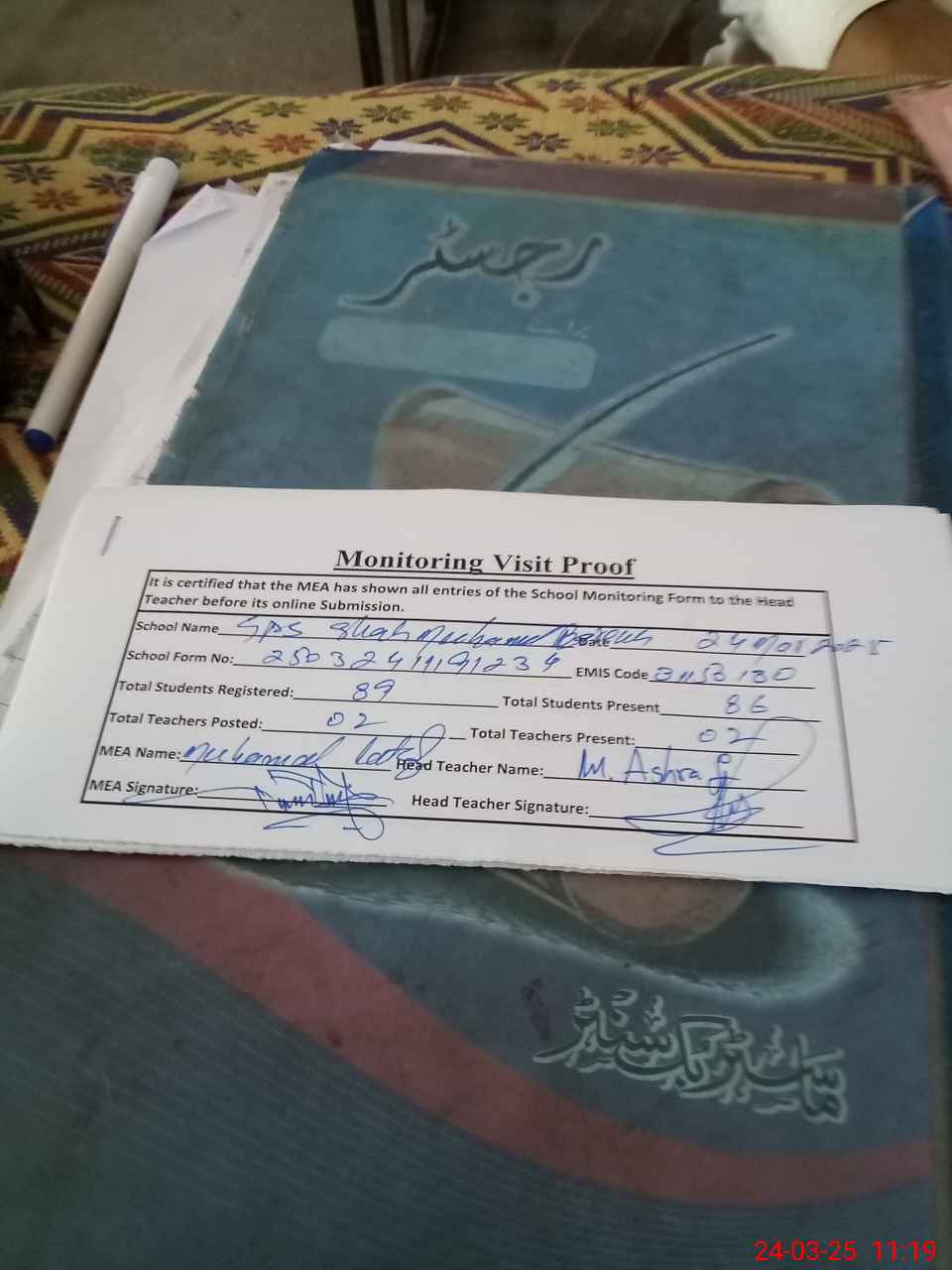 | Name: MU**** AS**** Designation: (School Headmaster's/Headmistress's) PST Phone/Cell Number: 03**** |