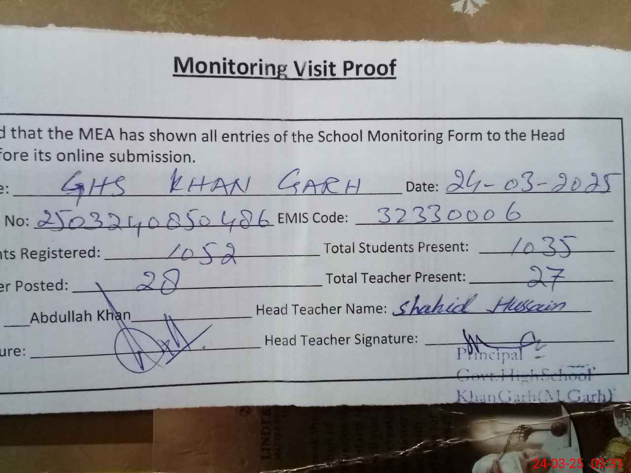 | Attendance Register | Head Teacher | MEA with School | Visit Proof |