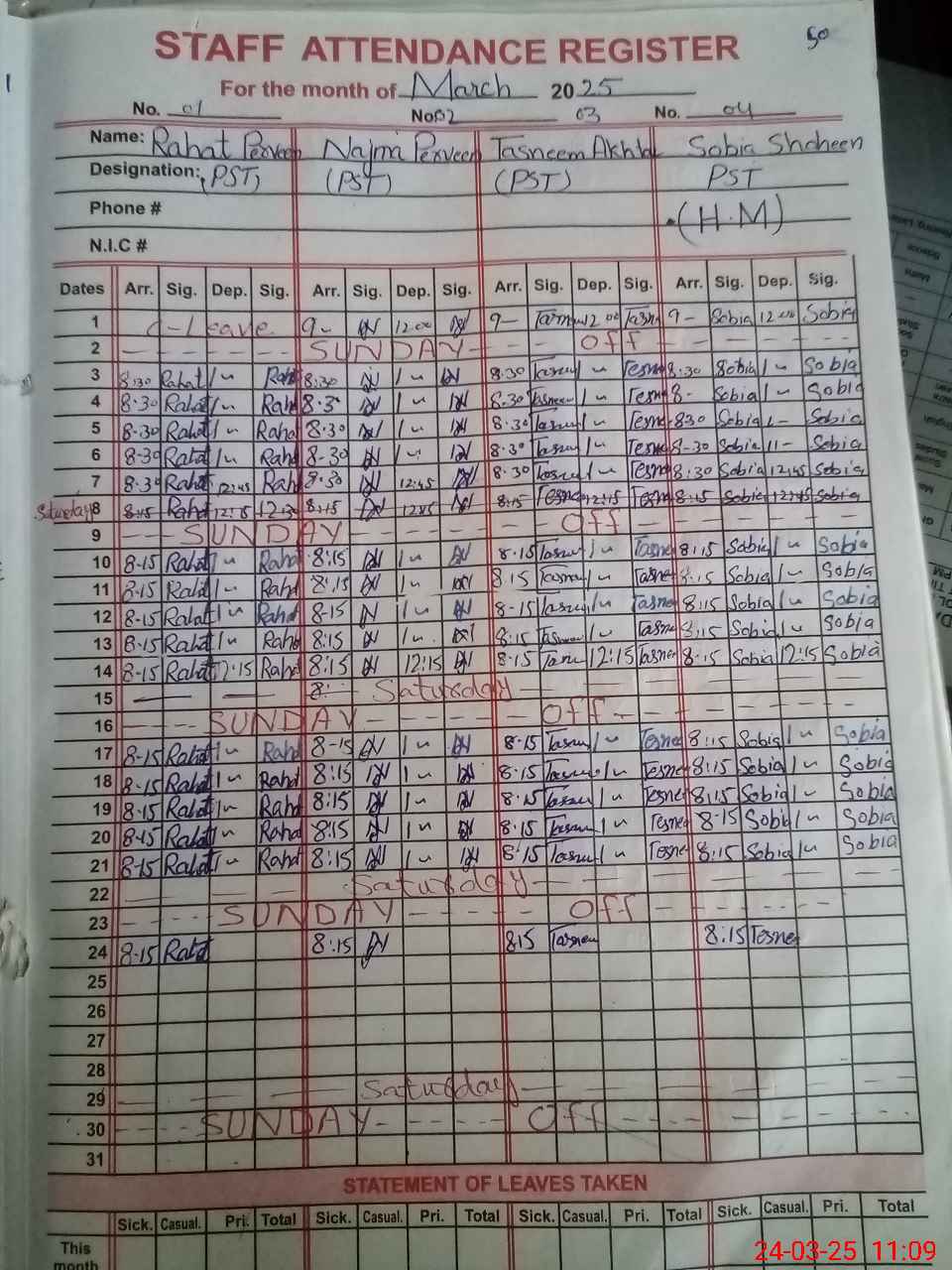 | CNIC | Full Name | Designation | R/C | Absence During Last Calender Month |