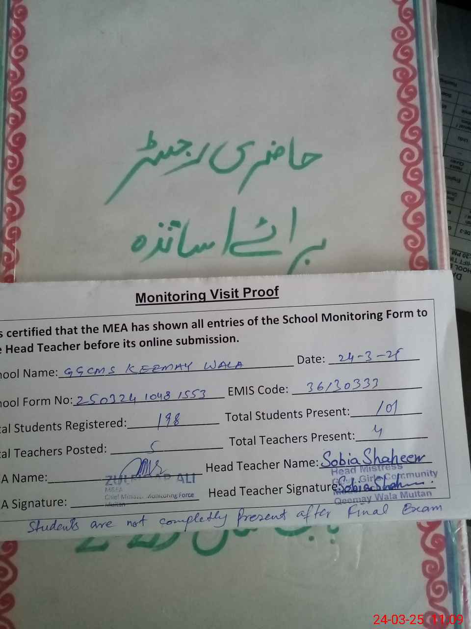 | Attendance Register | Head Teacher | MEA with School | Visit Proof |