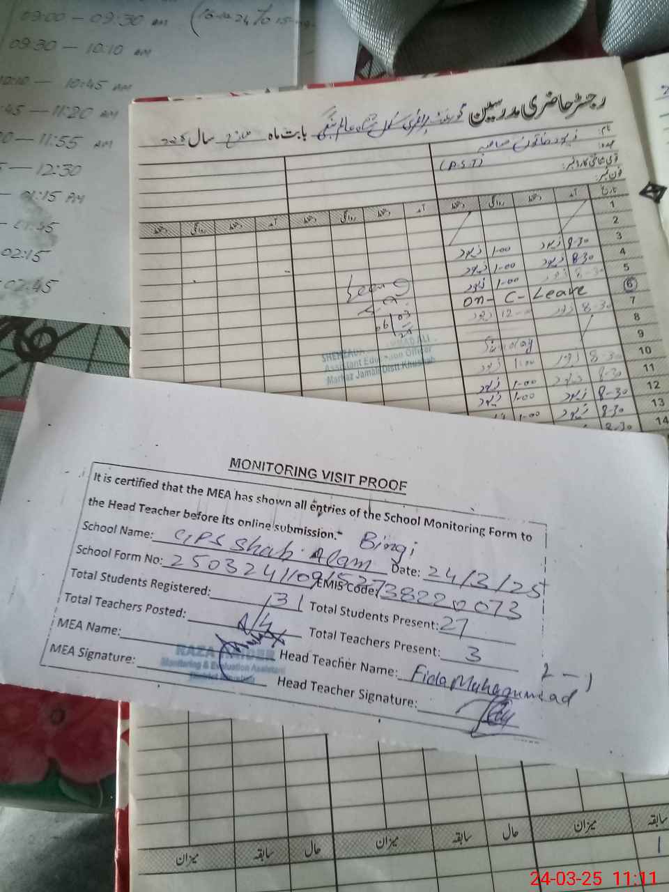 | Attendance Register | Head Teacher | MEA with School | Visit Proof |