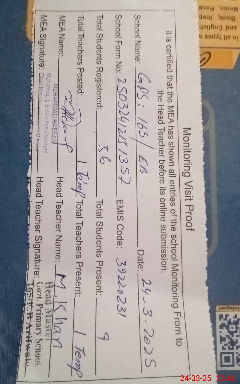 | EMIS Code: 39220231 | Name of School: GPS 165 EB P.O 163 E.B ARIF WALA | |||