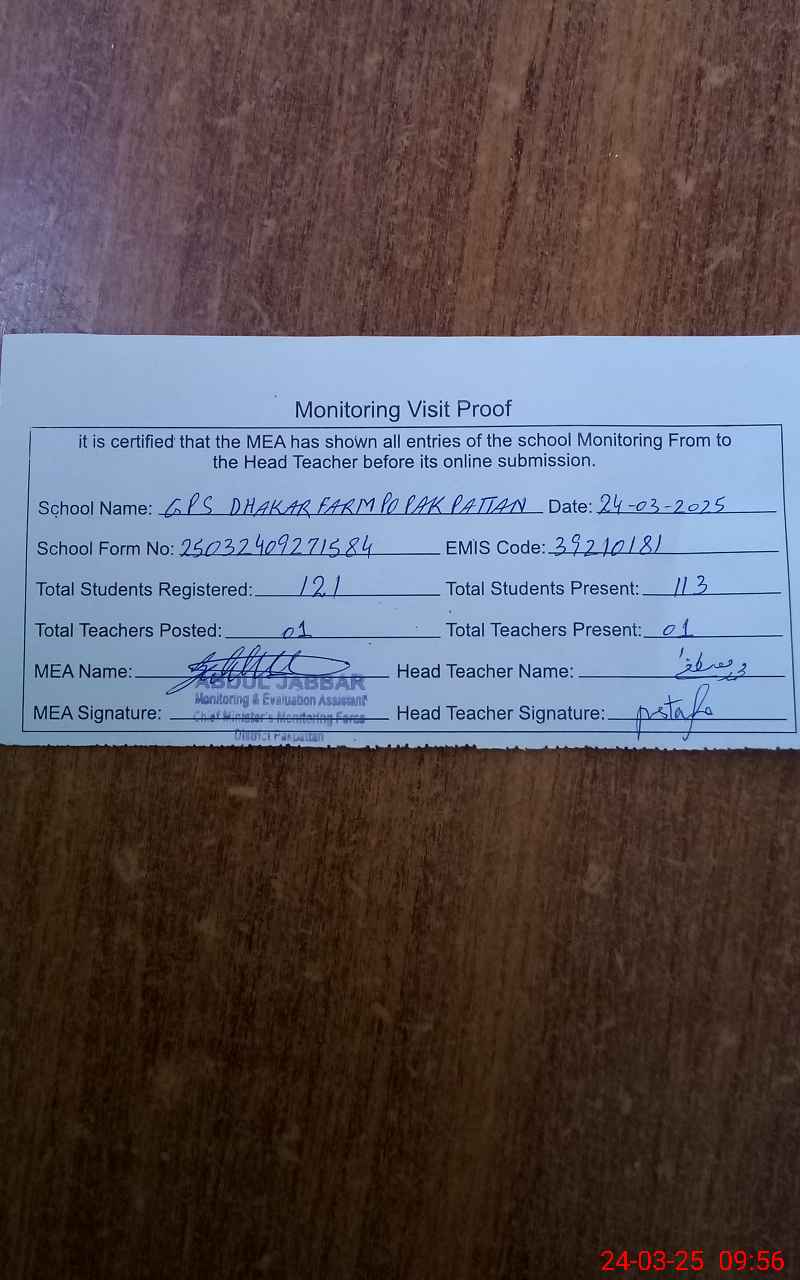 | EMIS Code: 39210181 | Name of School: GPS DHAKAR FARM PO PAKPATTAN | |||