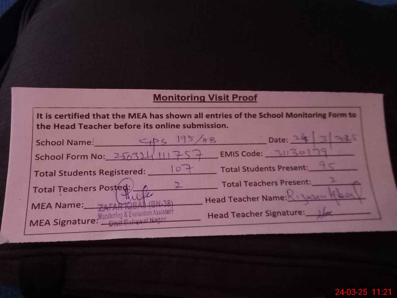 | Attendance Register | Head Teacher | MEA with School | Visit Proof |