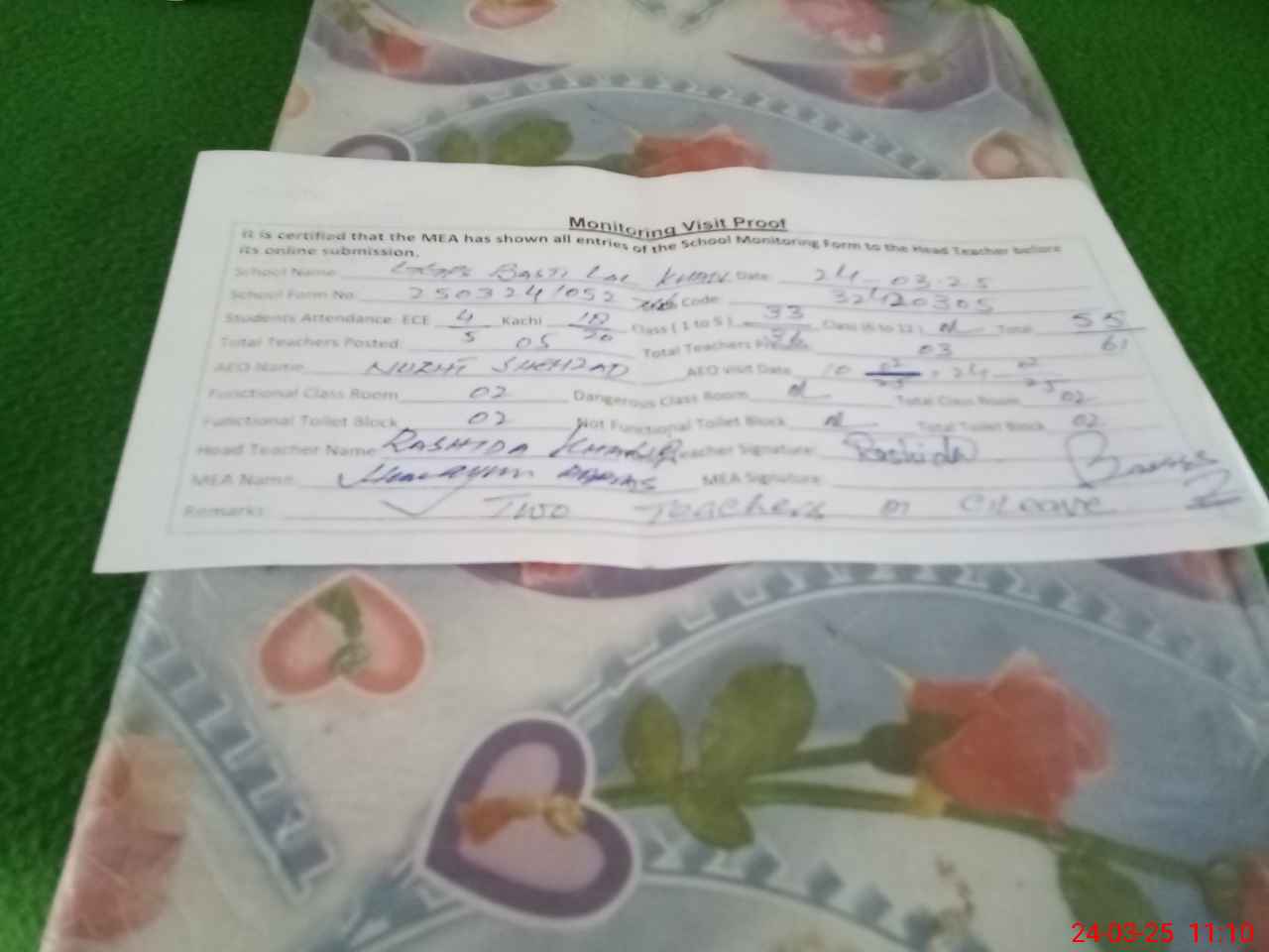 | Remarks (Use Separate Page if Required): Two teachers on casual leave students enrollment low over All cleaness good | |||||