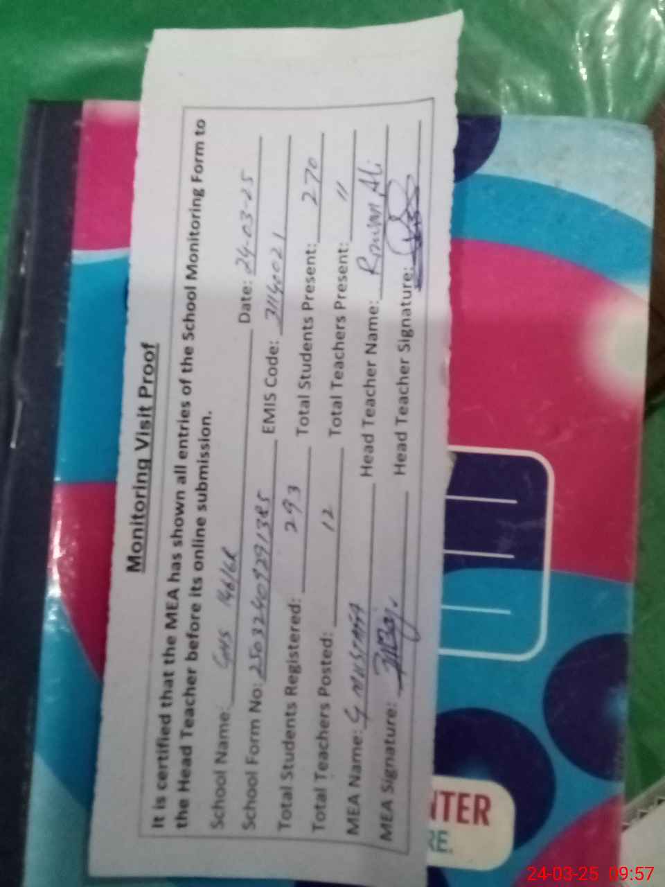 | Attendance Register | Head Teacher | MEA with School | Visit Proof |