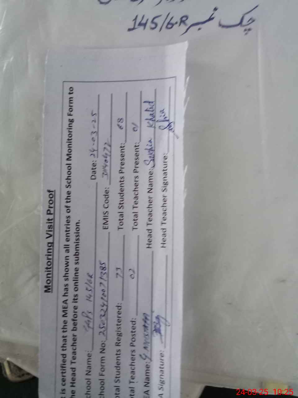 | Name: SA**** KH**** Designation: (School Headmaster's/Headmistress's) PTC Phone/Cell Number: 03**** |