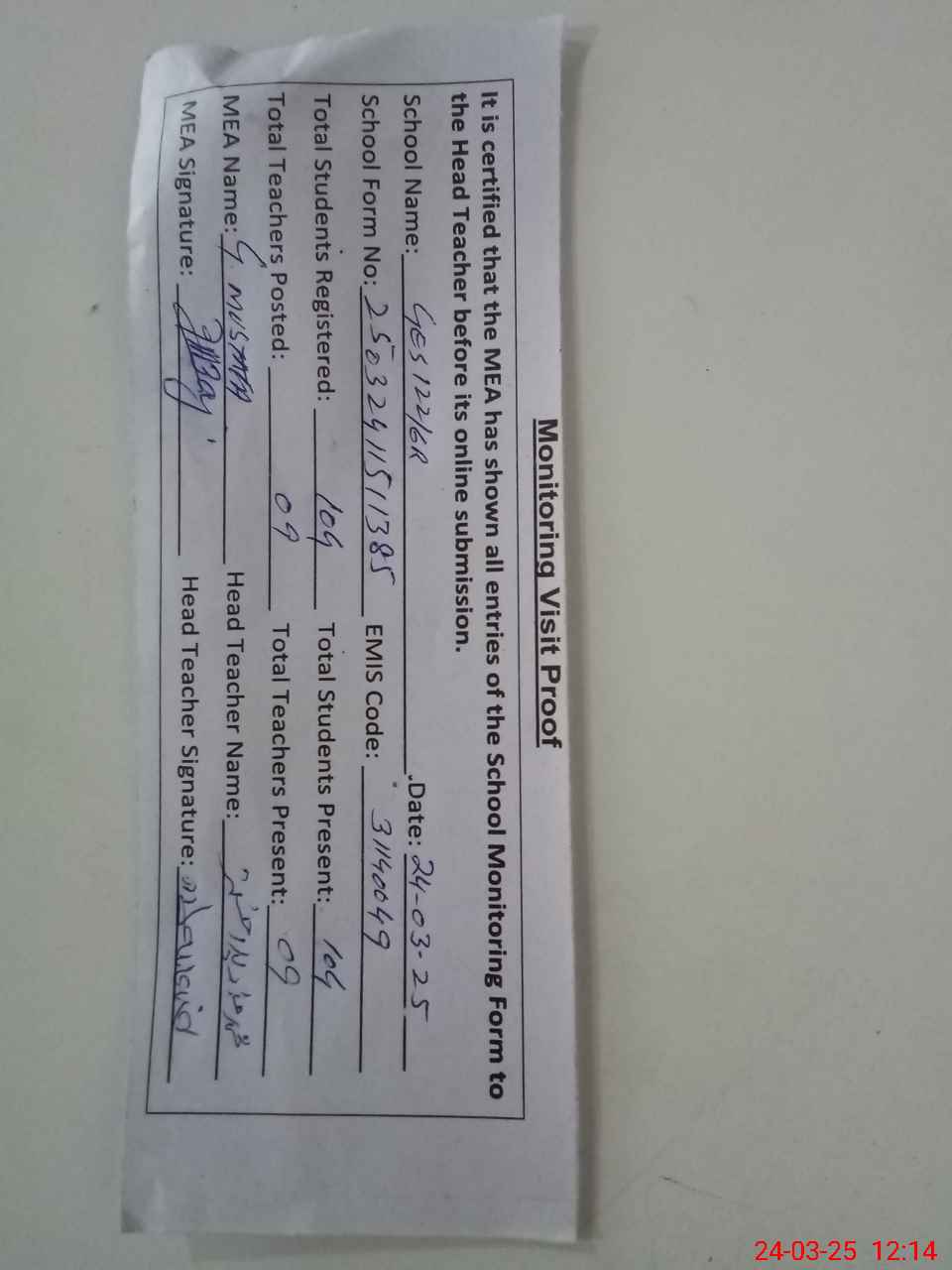 | Attendance Register | Head Teacher | MEA with School | Visit Proof |