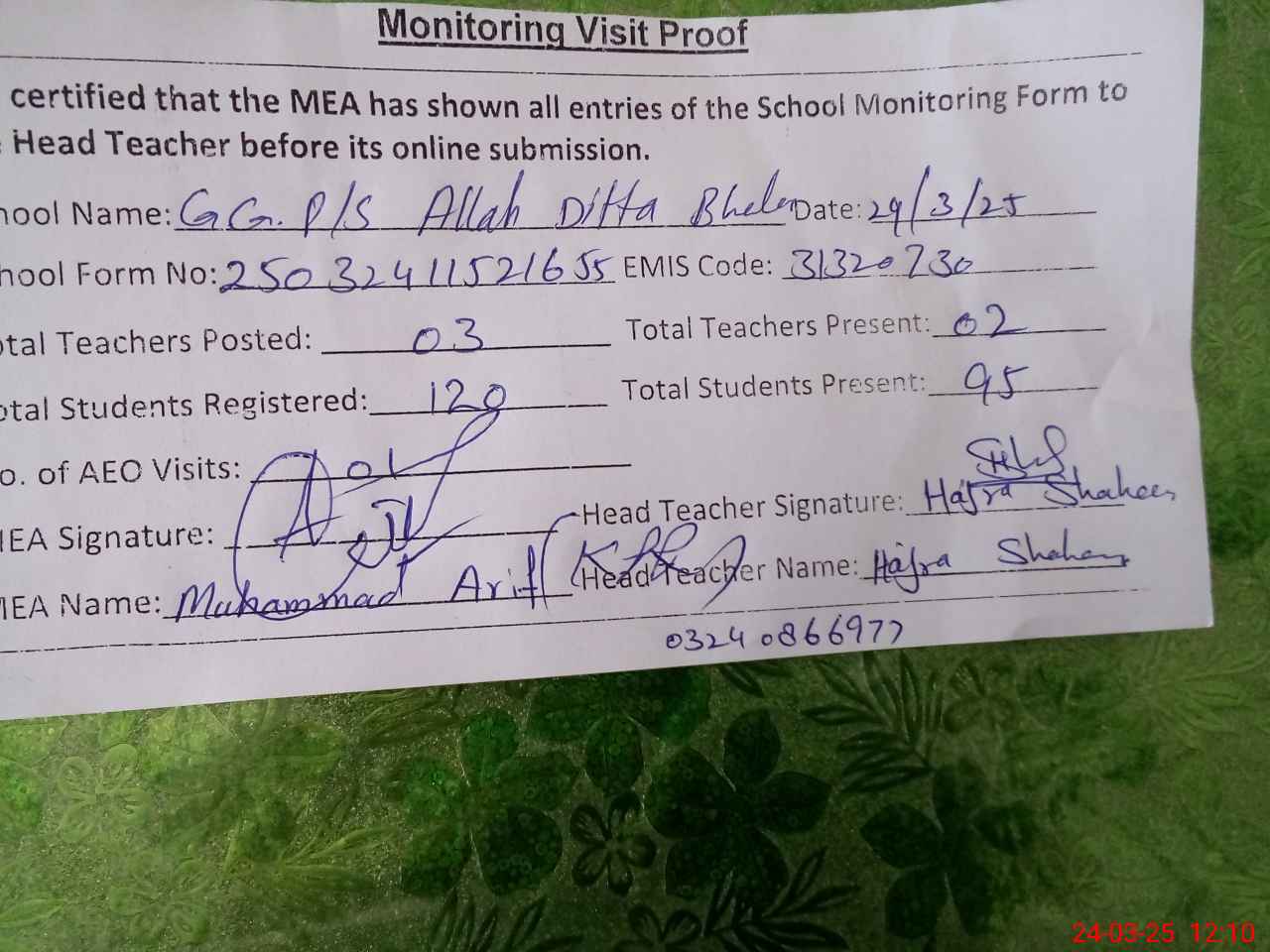 | Name: HA**** SH**** Designation: (School Headmaster's/Headmistress's) PST/PTC/JV Phone/Cell Number: 03**** |