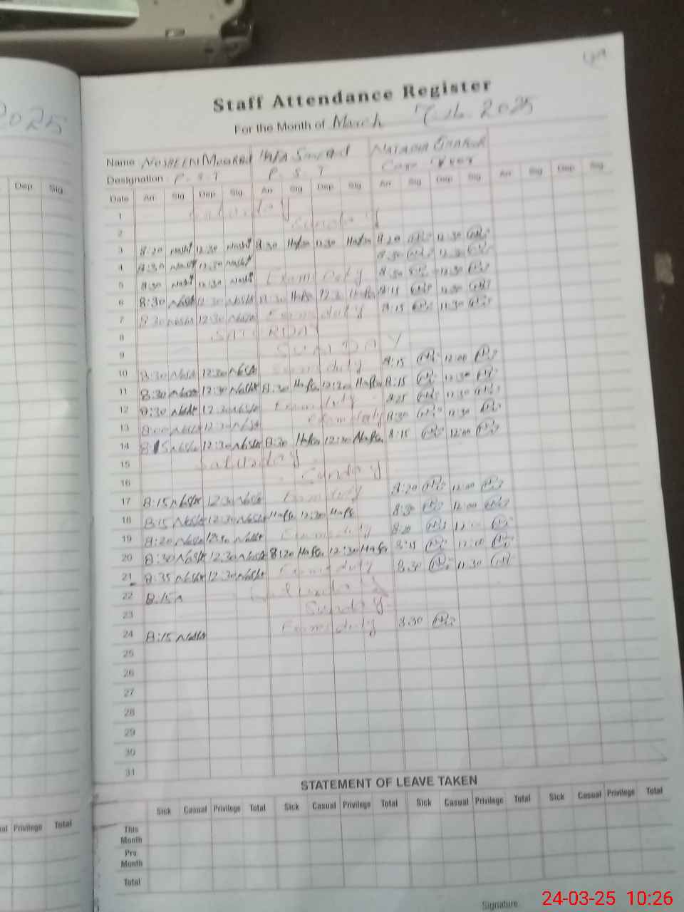 | Total no. of Classrooms: 2 No. of Classrooms Used for Teaching: 2 No. of Classrooms Storing Old Furniture, FTBs, etc: 0Comments if Any: Nsb not shown to mea Free text books not issued No Aeo visit in Feb 25 |