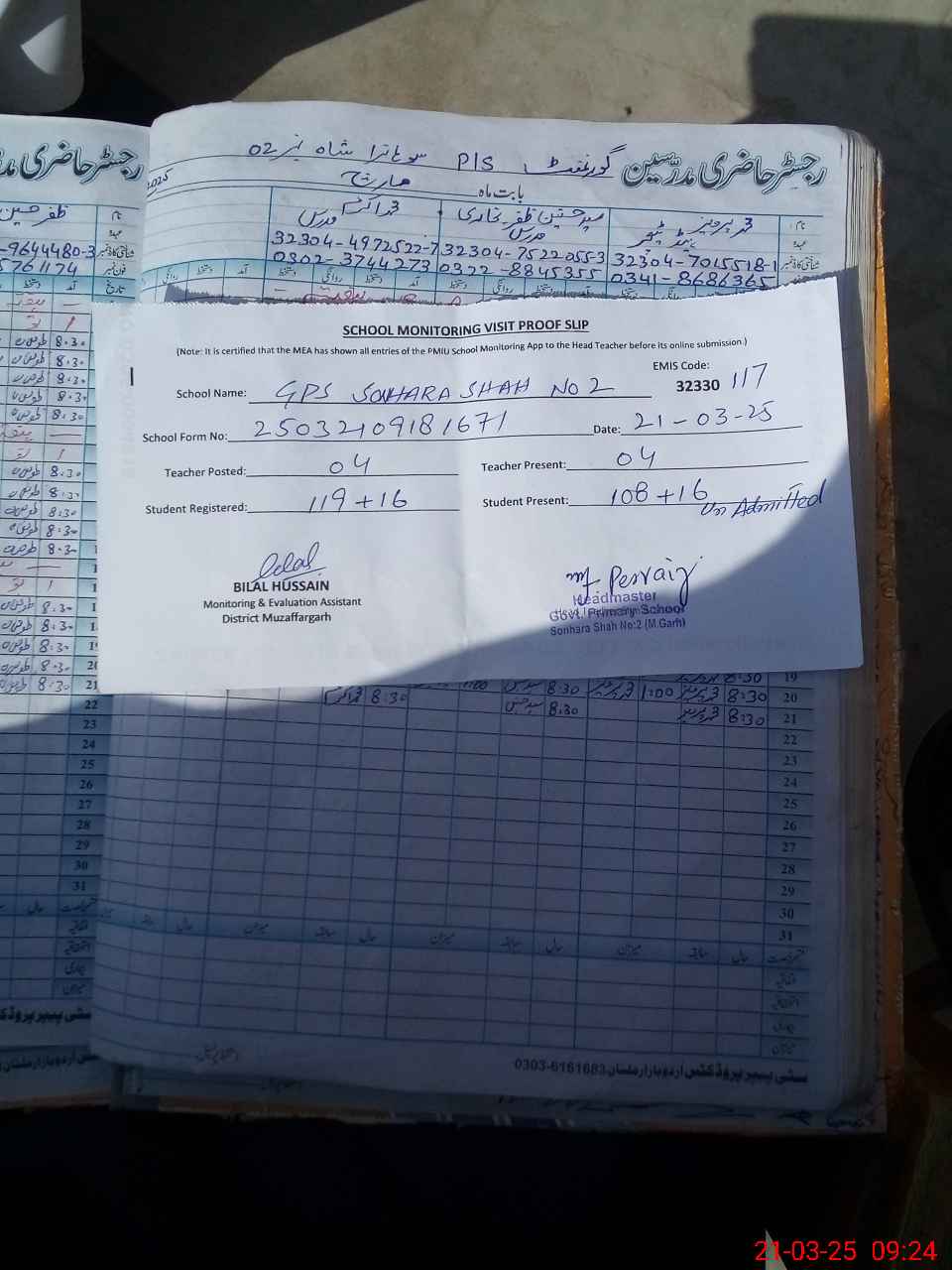 | Name: MU**** PE**** Designation: (School Headmaster's/Headmistress's) PST Phone/Cell Number: 03**** |