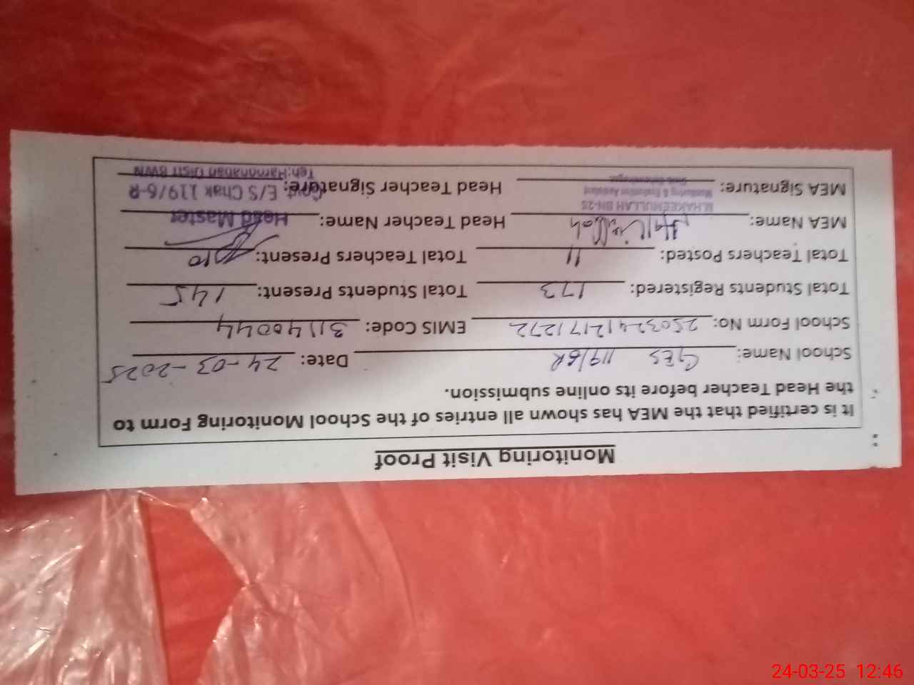| Certified that this School was Inspected by the Undersigned MEA/DMO Today and the Information Stated Above is as Per Record. | |||||