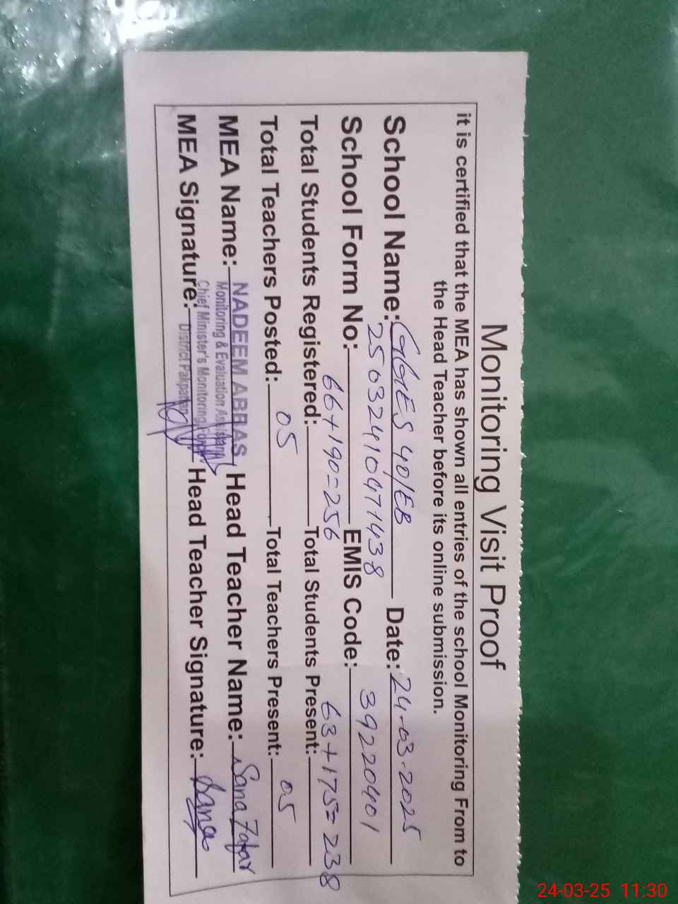 | Certified that this School was Inspected by the Undersigned MEA/DMO Today and the Information Stated Above is as Per Record. | |||||