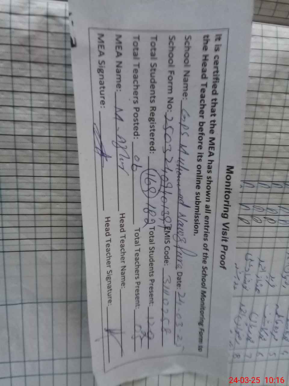 | Attendance Register | Head Teacher | MEA with School | Visit Proof |