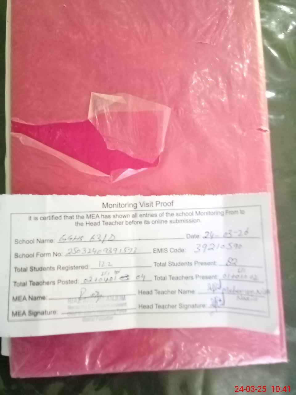 | Attendance Register | Head Teacher | MEA with School | Visit Proof |