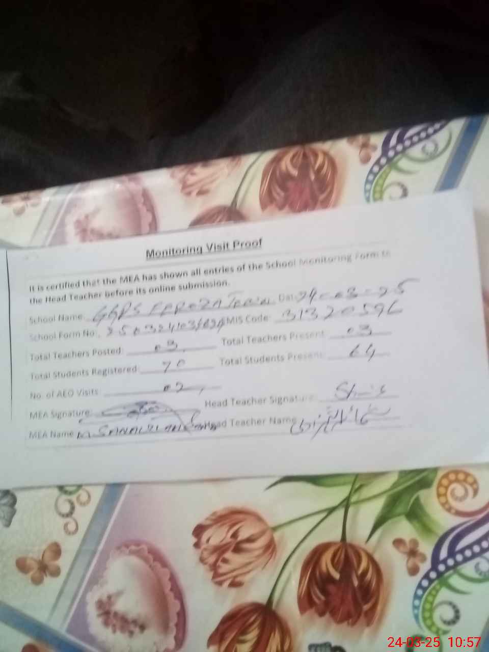 | Attendance Register | Head Teacher | MEA with School | Visit Proof |