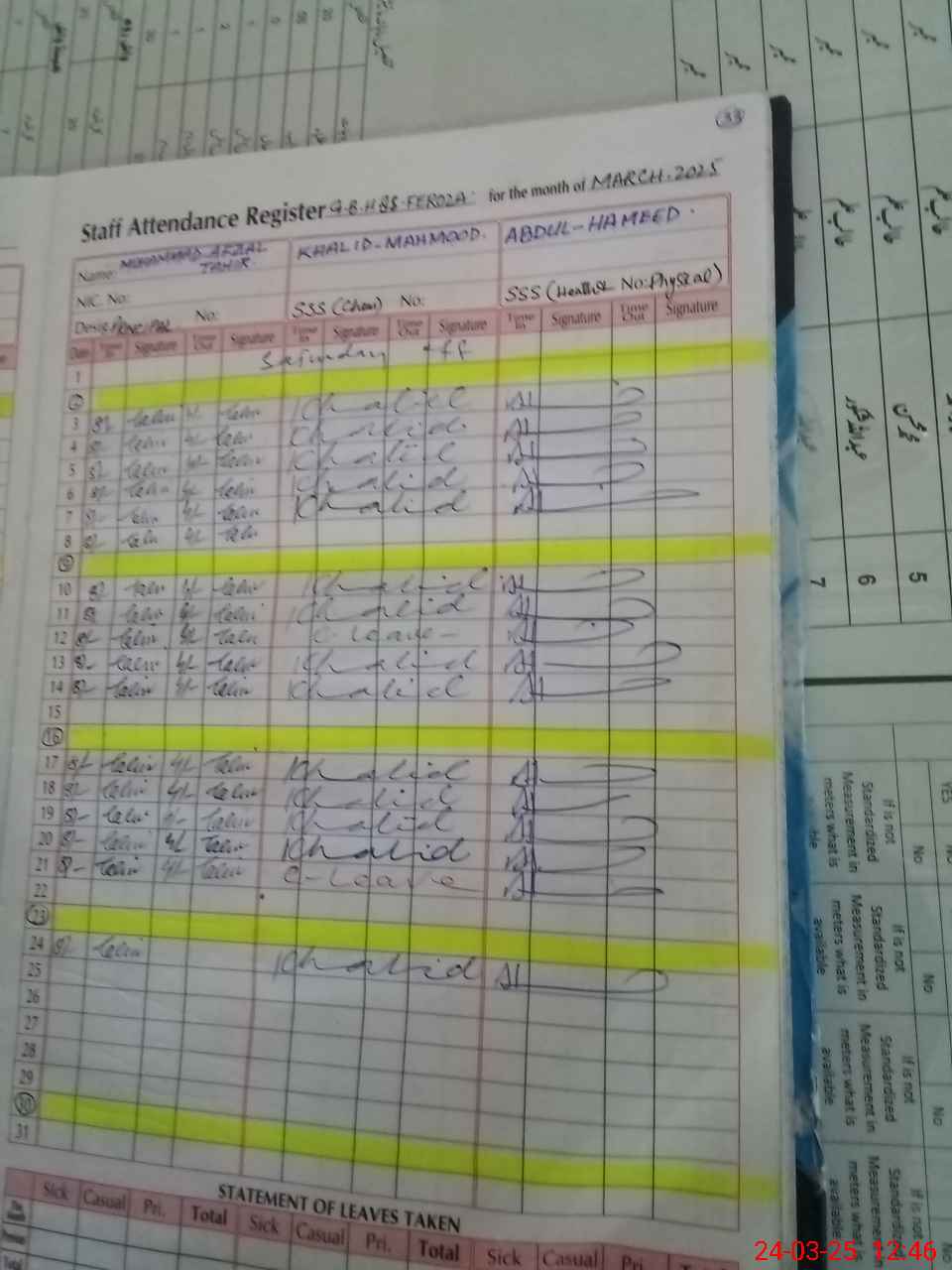 | CNIC | Full Name | Designation | R/C | Absence During Last Calender Month |