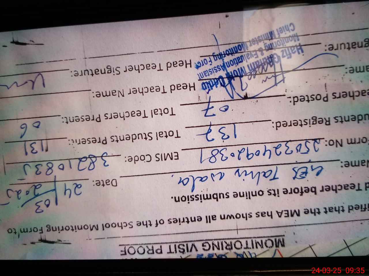 | Certified that this School was Inspected by the Undersigned MEA/DMO Today and the Information Stated Above is as Per Record. | |||||