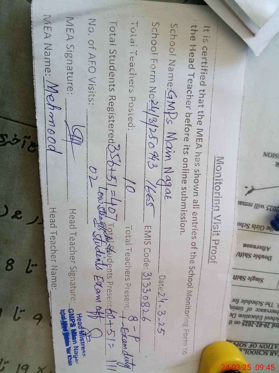 | Certified that this School was Inspected by the Undersigned MEA/DMO Today and the Information Stated Above is as Per Record. | |||||