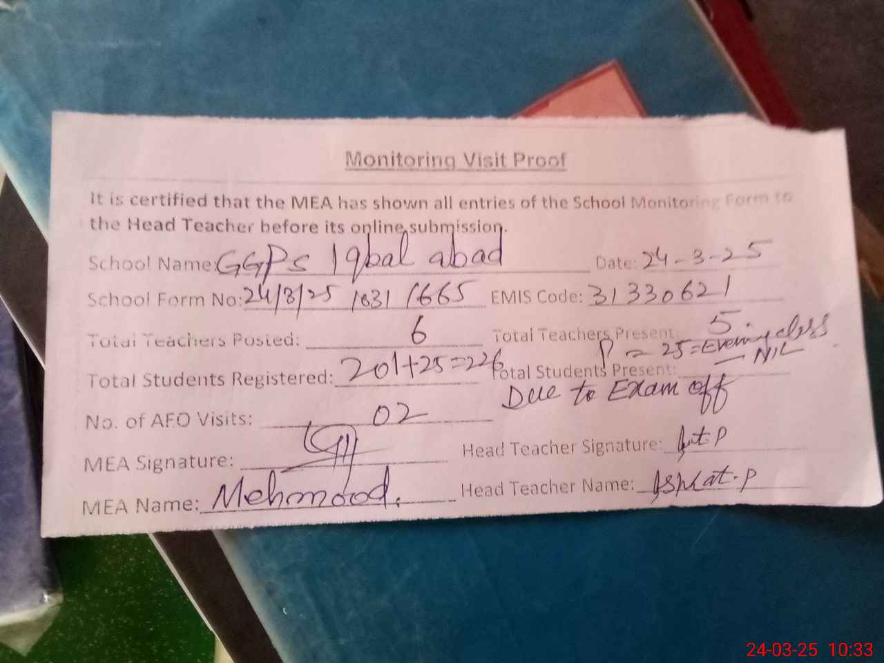 | EMIS Code: 31330621 | Name of School: GGPS IQBAL ABAD | |||