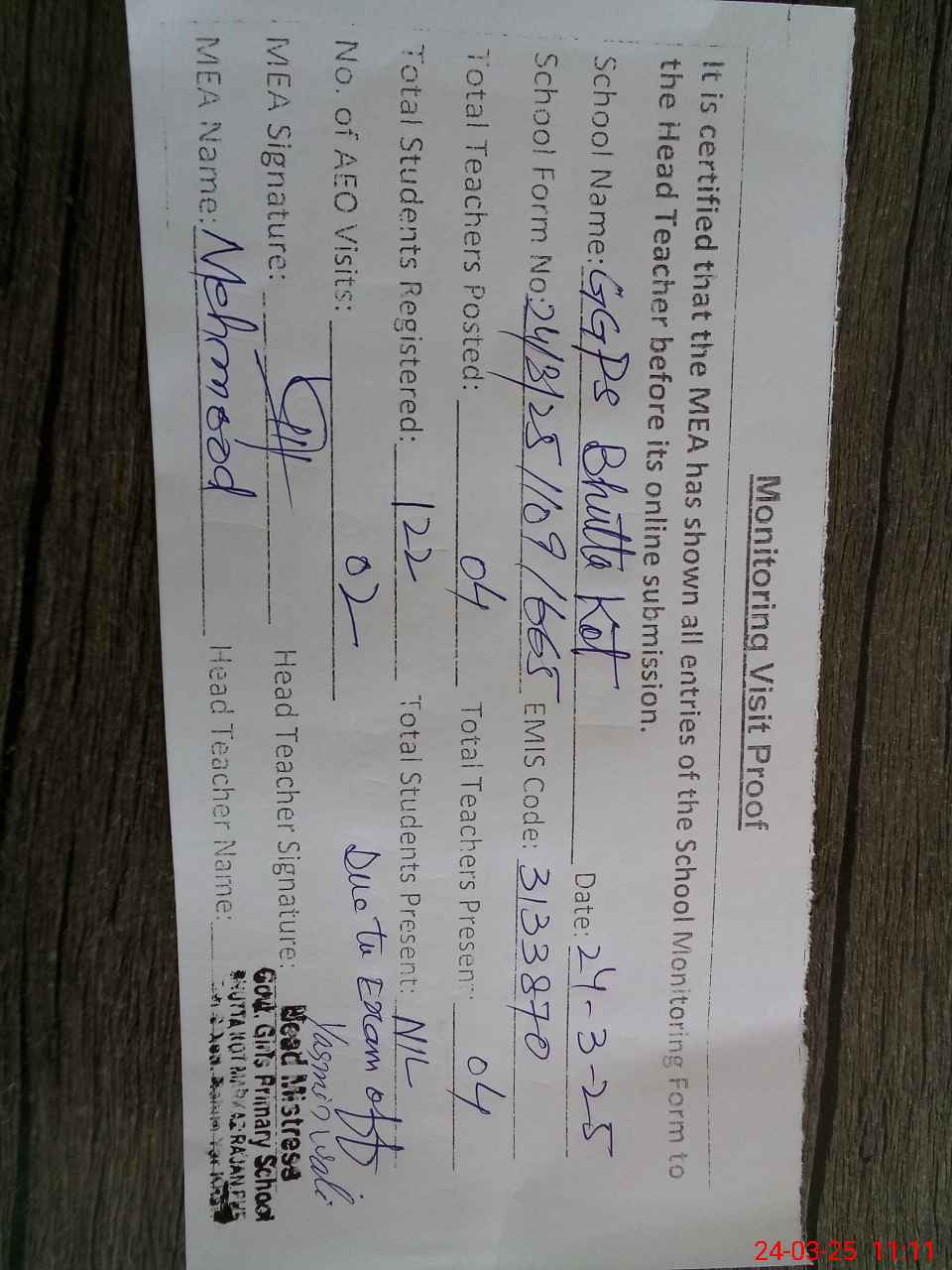 | Attendance Register | Head Teacher | MEA with School | Visit Proof |