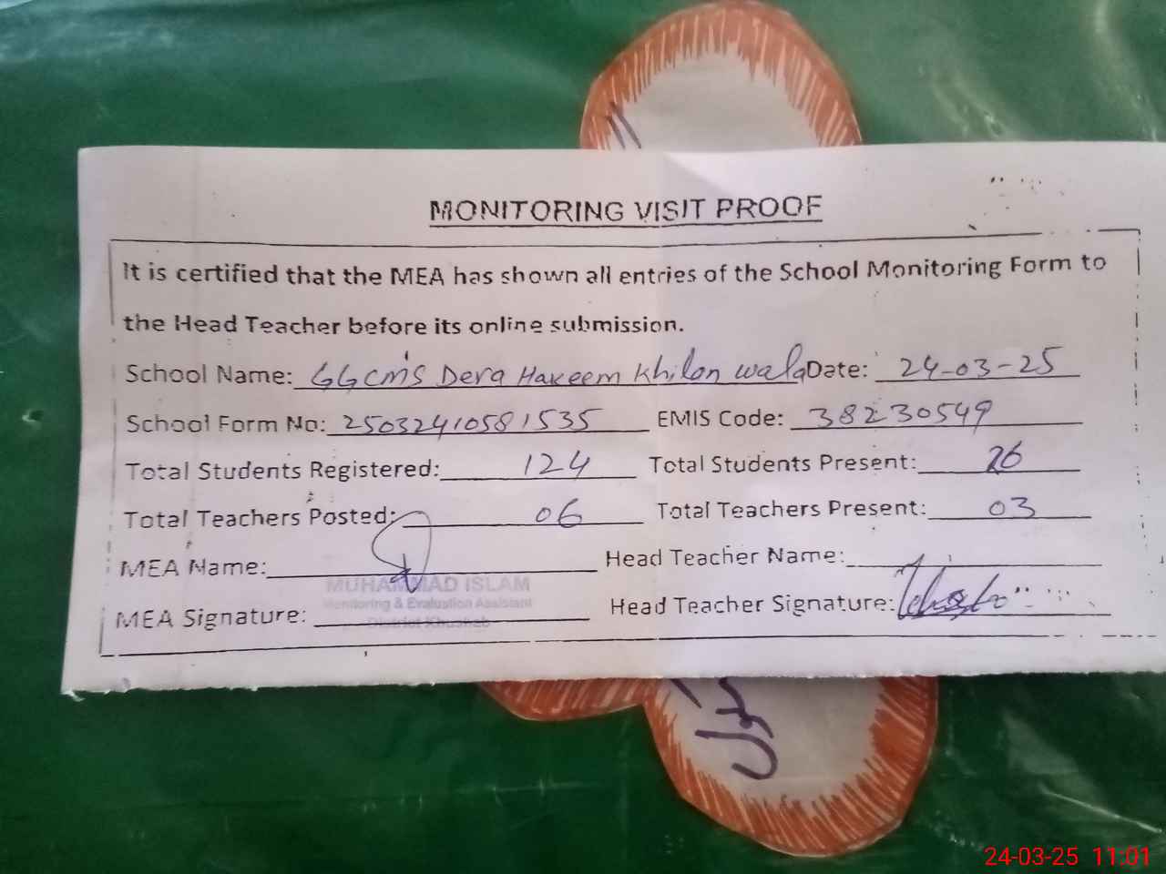 | EMIS Code: 38230549 | Name of School: GGCMS DERA HAKEEM KHILAN WALA | |||