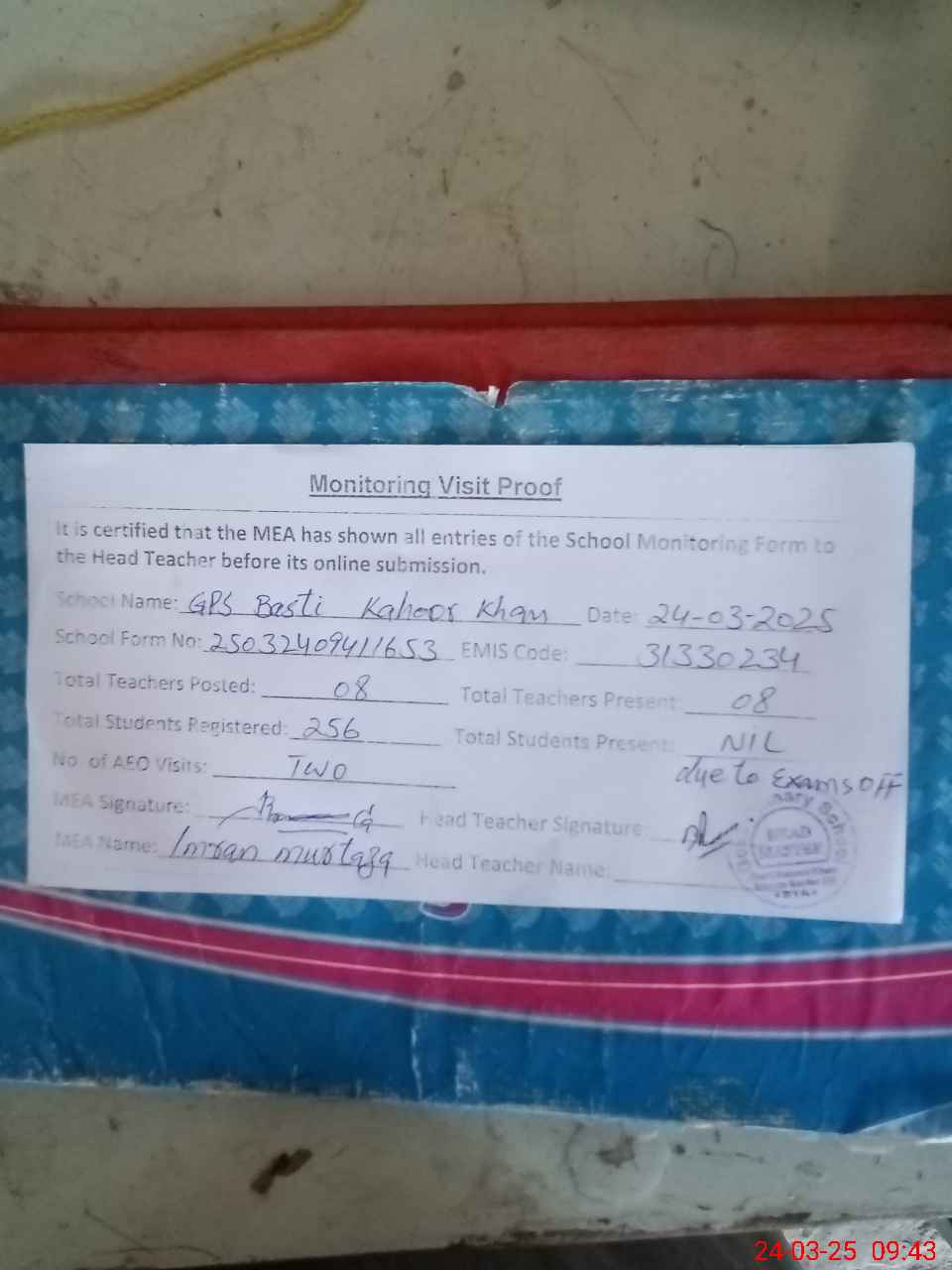 | Attendance Register | Head Teacher | MEA with School | Visit Proof |