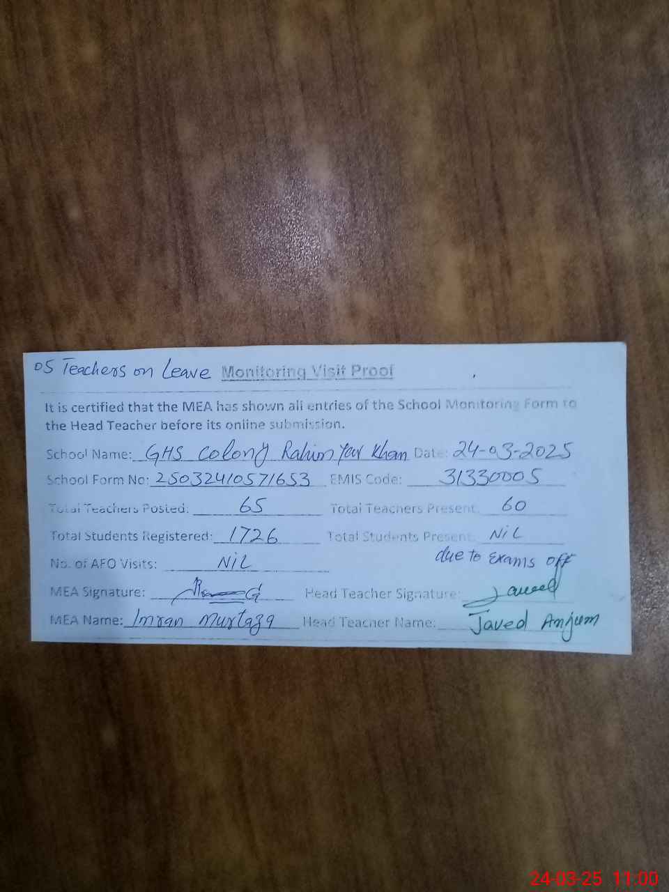 | Attendance Register | Head Teacher | MEA with School | Visit Proof |