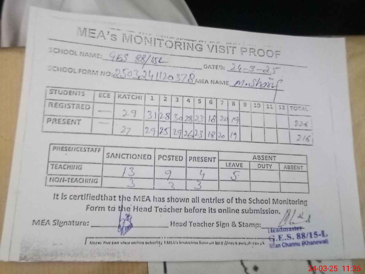 | EMIS Code: 36430055 | Name of School: GES 88/15-L P/O 87/15-L, MIAN CHANNU | |||