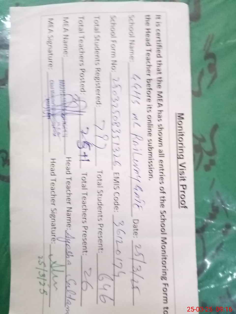 | Attendance Register | Head Teacher | MEA with School | Visit Proof |