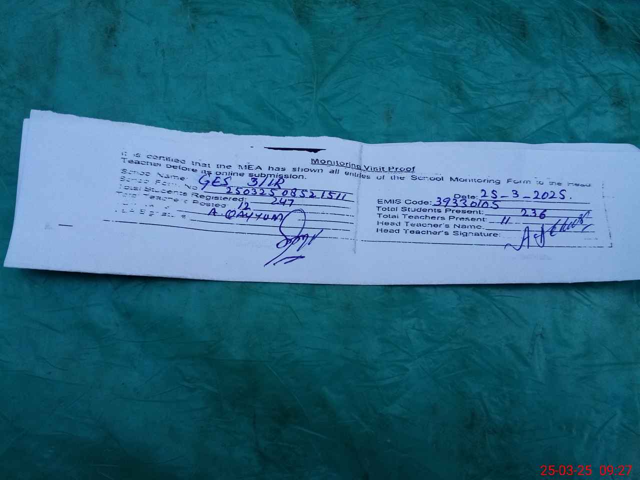 | Attendance Register | Head Teacher | MEA with School | Visit Proof |