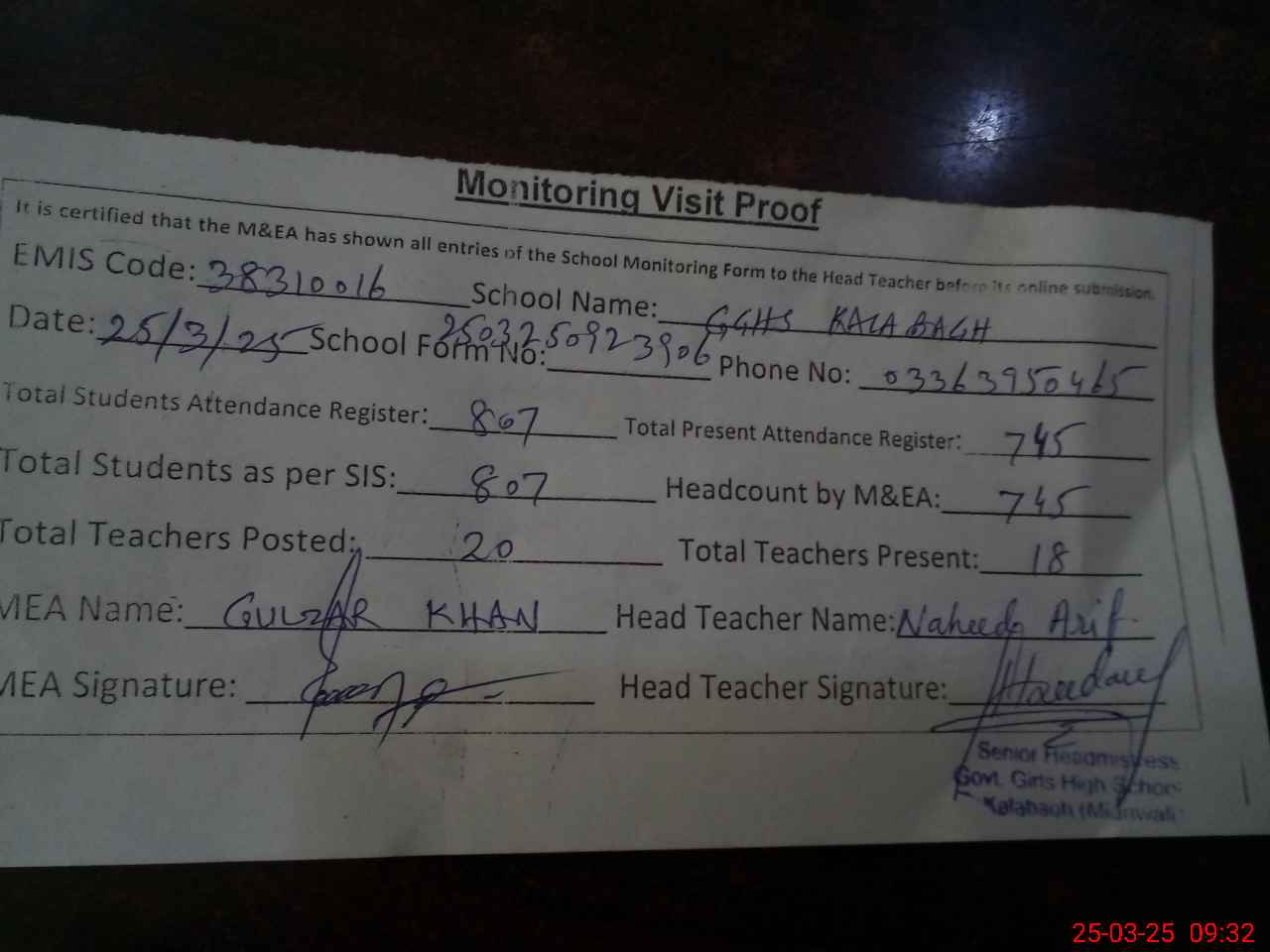 | EMIS Code: 38310016 | Name of School: GGHS KALA BAGH | |||