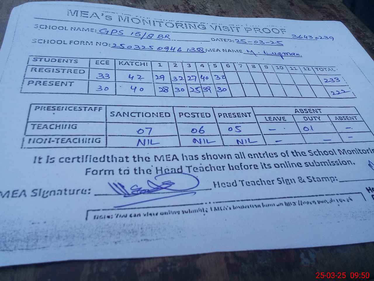 | Attendance Register | Head Teacher | MEA with School | Visit Proof |