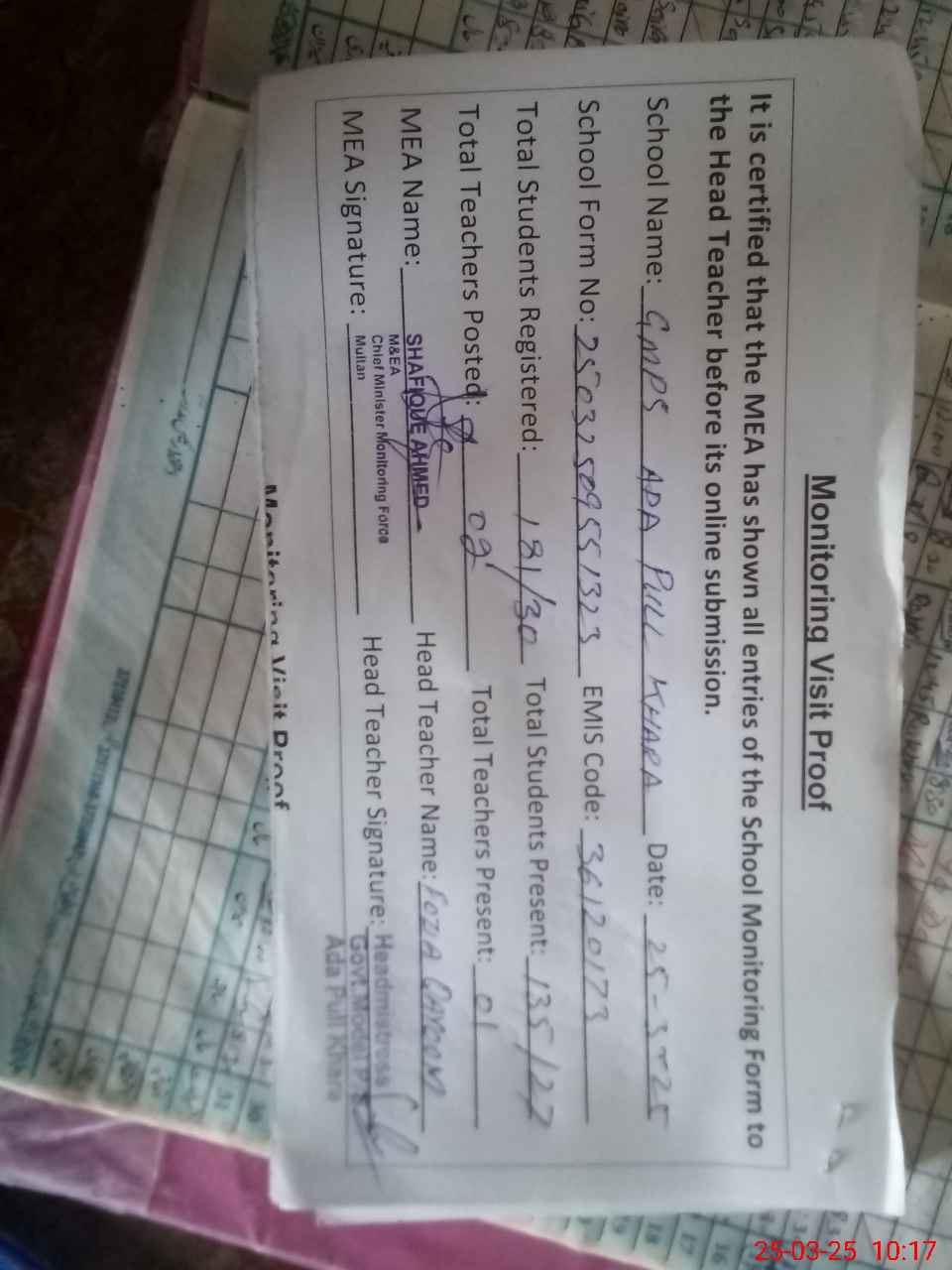 | Attendance Register | Head Teacher | MEA with School | Visit Proof |