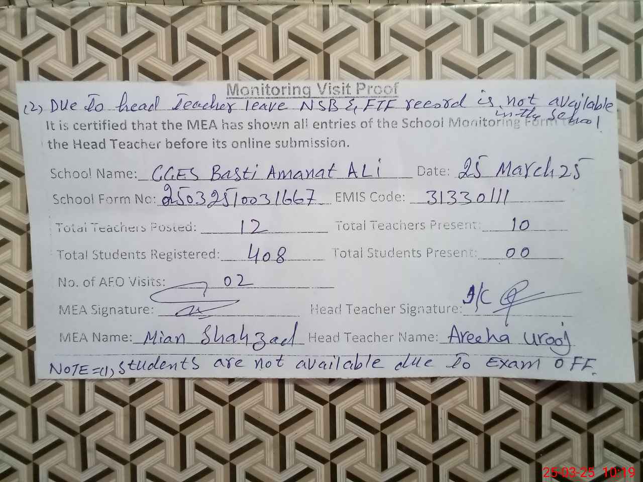 | EMIS Code: 31330111 | Name of School: GGES BASTI AMANAT ALI | |||