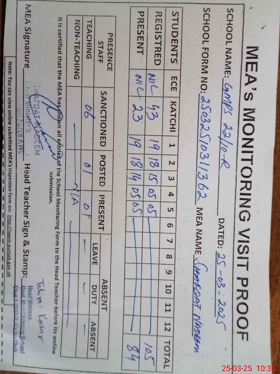| Certified that this School was Inspected by the Undersigned MEA/DMO Today and the Information Stated Above is as Per Record. | |||||